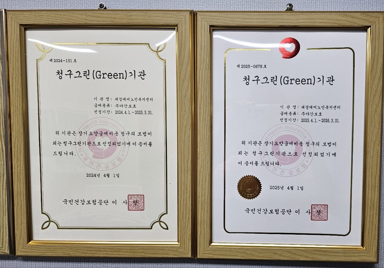 안녕하세요 대경케어주간보호센터 입니다. 저희 센터에 기쁜 소식이 있어 전해 드리려 합니다. 2024년에 이어 2025년에도 저희 기관이 청구그린기관으로 선정 되었습니다. 청구그린기관이란? 정확하고 투명한 청구능력을 통해 장기요양급여의 수준향상에 예천군에서 유일하게 2년 연속 선정된 저희 대경케어주간보호센터 라고 합니다. 2년 연속은 전국에서도 매우 드문 일이라고 합니다. 앞으로도 저희 대경케어주간보호센터는 정직하고 깨끗한 기관 운영으로 믿을 수 있는 주간보호센터로 최선을 다 하겠습니다.