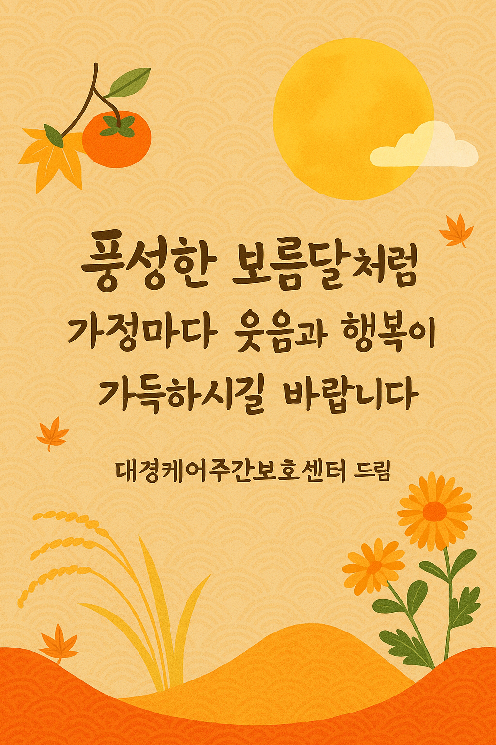 ![]() 안녕하세요, 대경케어 주간보호센터입니다. 민족의 큰 명절, 한가위를 맞이하여 보호자님 가정에 늘 건강과 평안이 가득하시길 기원드립니다. 늘 저희 센터를 믿고 함께해 주시며, 어르신들께서 웃음과 행복으로 하루하루를 보내실 수 있도록 응원해 주심에 깊은 감사의 말씀을 드립니다. 추석은 가족의 따뜻한 정과 풍성한 나눔을 함께하는 뜻깊은 명절입니다. 저희 대경케어 주간보호센터는 보호자님들의 따뜻한 마음을 이어받아, 어르신들께서 센터에서 지내시는 시간이 언제나 가족처럼 편안하고 즐거울 수 있도록 더욱 정성을 다하겠습니다. 추석 연휴를 맞아 10월6일(월) ~ 10월7일(화) 휴관 합니다. 올 한가위도 넉넉한 보름달처럼 보호자님 가정에 건강과 웃음, 평안이 가득하시길 바라며, 앞으로도 저희 센터가 든든한 동반자가 될 수 있도록 최선을 다하겠습니다. 풍성한 추석 명절 되시고, 사랑하는 가족분들과 함께 행복한 시간 보내시길 바랍니다. 감사합니다. |